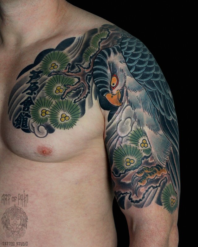 Татуировка мужская япония на плече голубой орел 4691