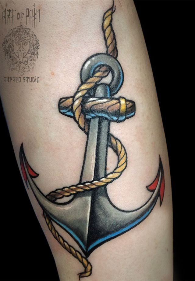 Татуировка мужская олд скул на предплечье якорь 477