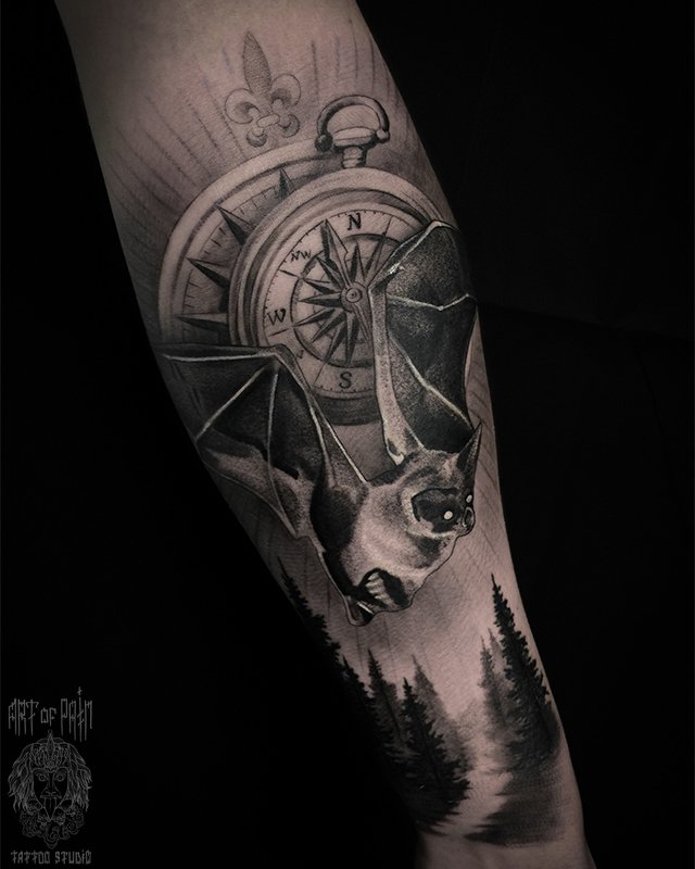 Татуировка мужская реализм на предплечье летучая мышь и компас (Анастасия Юсупова) 4781