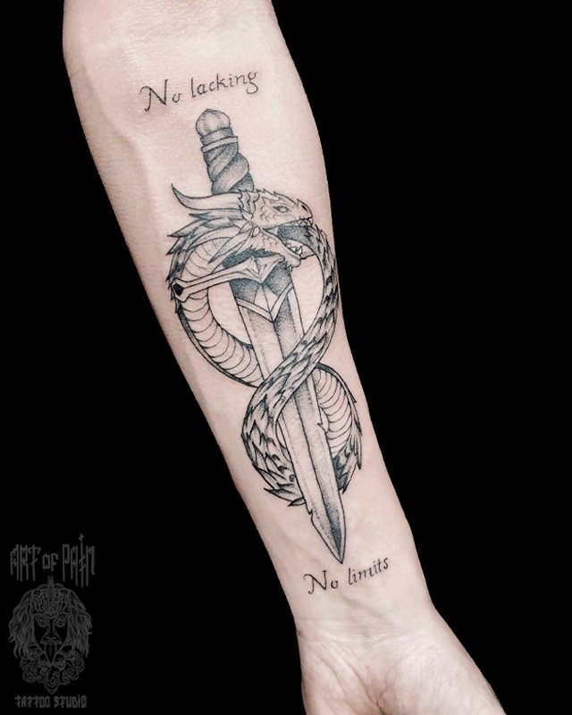 Татуировка мужская графика на предплечье уроборос и кинжал (Мария Котова) 4793