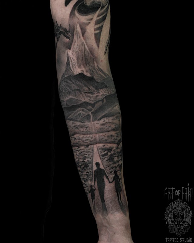 Татуировка мужская реализм на предплечье пейзаж и люди 4807