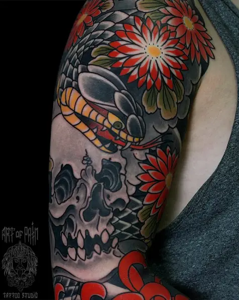 Татуировка мужская япония на плече череп, змея и красные цветы 4851