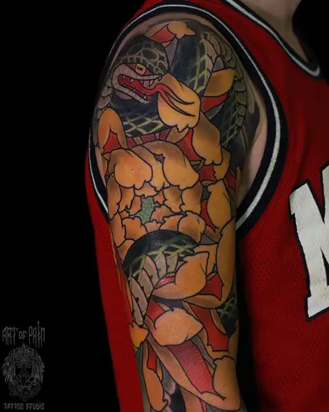 Татуировка мужская япония на плече хризантема и змея 4868