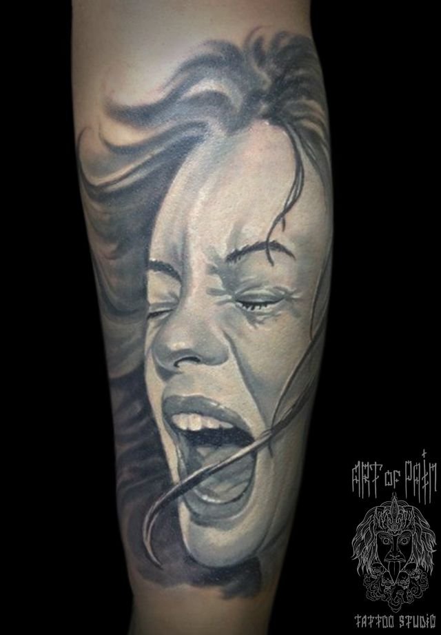 Татуировка мужская реализм на предплечье портрет кричащей девушки 486