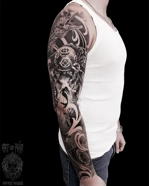 Татуировка мужская фентези тату-рукав русалка, водолаз, компас, рыба 4892