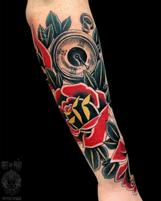 Татуировка мужская олд скул на предплечье розы и часы 4897