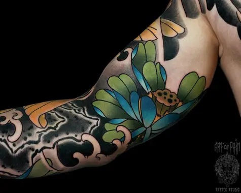 Татуировка мужская япония на бицепсе лотос 4909