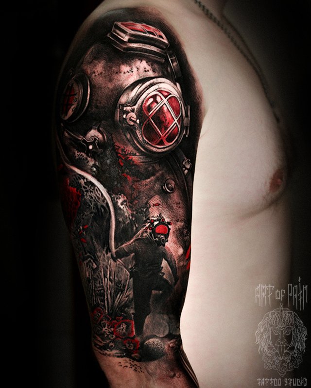 Татуировка мужская реализм на плече водолаз (Слава Tech Lunatic) 4930