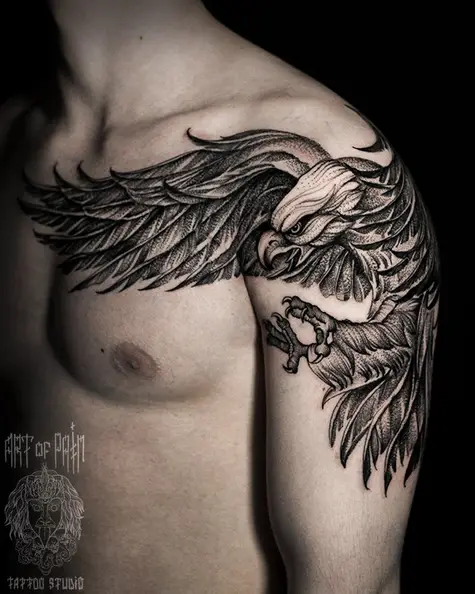 Татуировка мужская графика и дотворк на плече орел (Юрий Хандрыкин) 4947