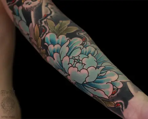 Татуировка мужская япония на предплечье пион 4954