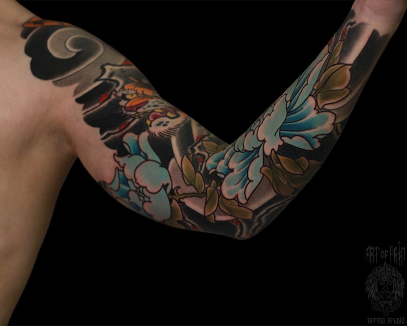 Татуировка мужская япония тату-рукав пионы 4955