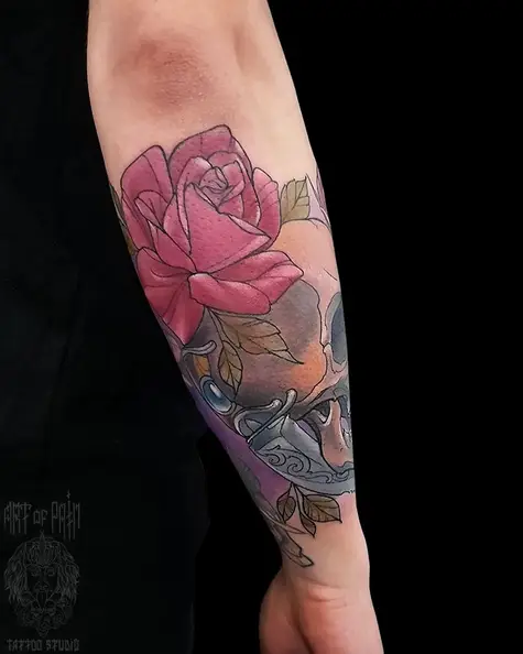 Татуировка мужская нью-скул на предплечье череп и розы 4963