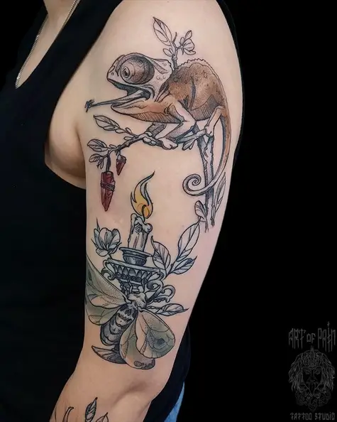 Татуировка мужская нью-скул на плече хамелеон и свеча 4995