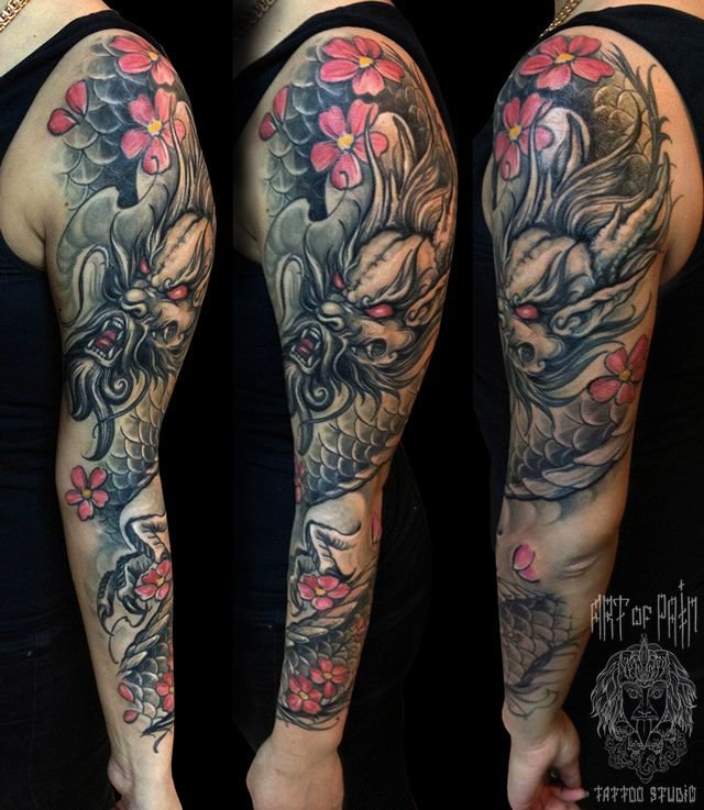 Татуировка мужская Япония рукав дракон и цветы 500