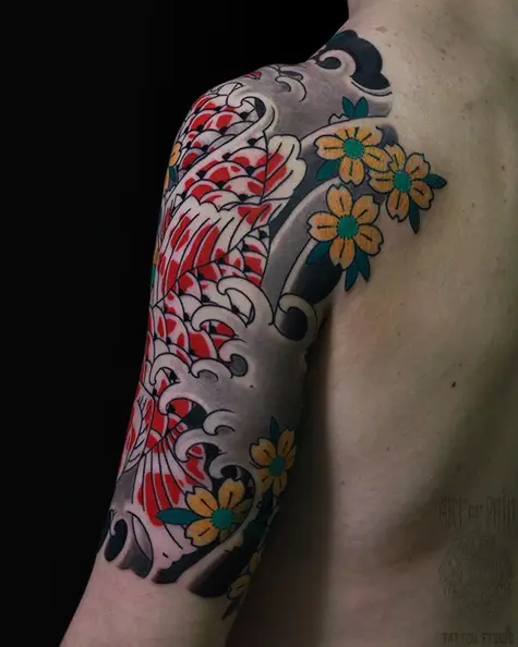 Татуировка мужская япония на плече карп, вид сзади 5011