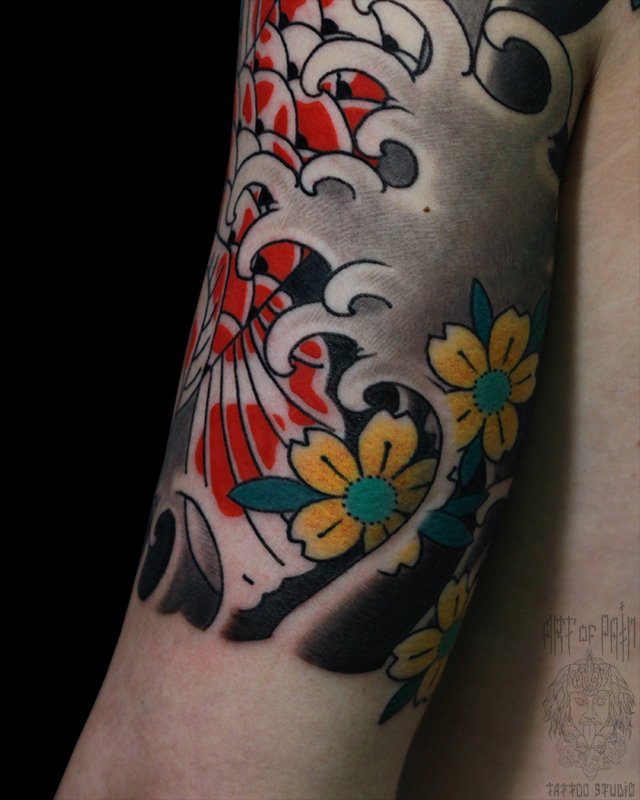 Татуировка мужская япония на плече волны и цветы 5014