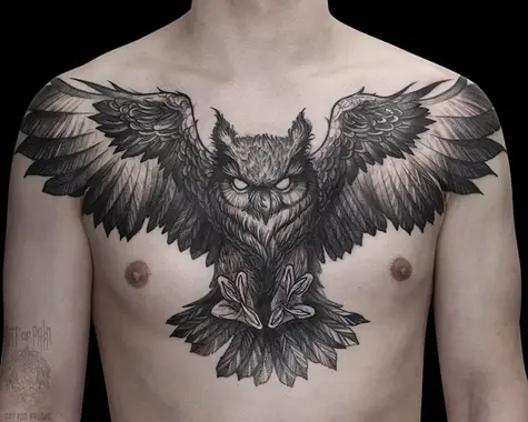 Татуировка мужская графика на груди филин 5023