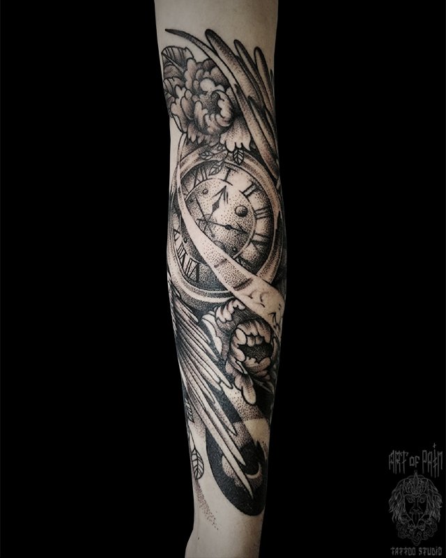 Татуировка мужская графика на руке часы, цветы (Николай Орф) 5031