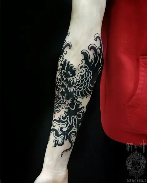 Татуировка мужская графика на предплечье черный феникс 5074