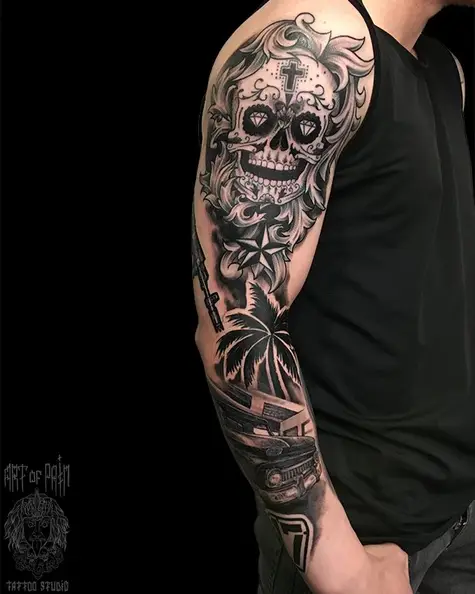 Татуировка мужская чикано тату-рукав череп, автомобиль, пальма 5122