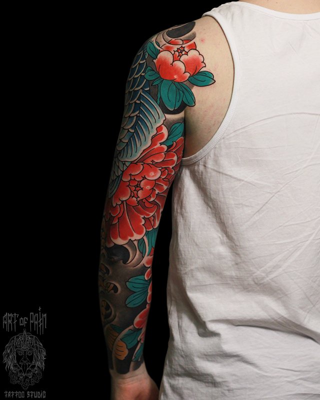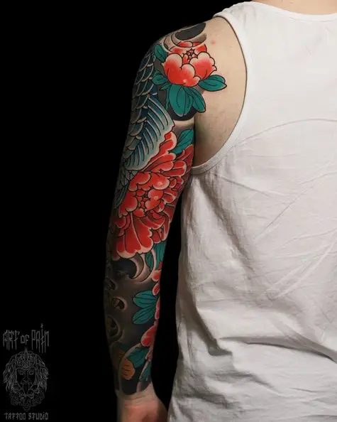 Татуировка мужская япония тату-рукав карпы, пионы 5136