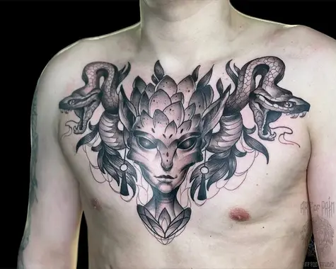Татуировка мужская нью скул на груди девушка, змеи 5170