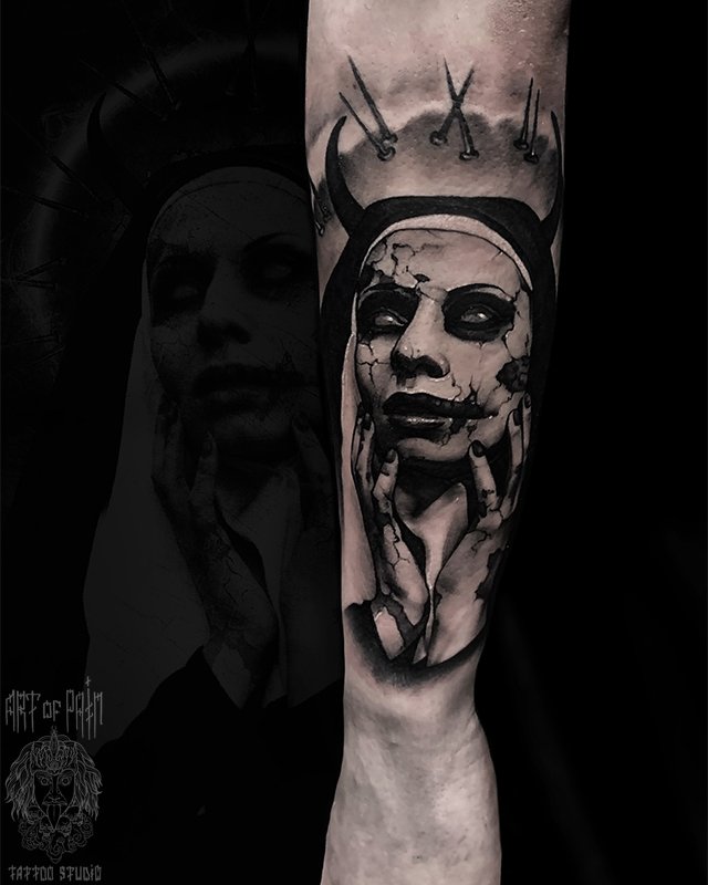 Татуировка мужская хоррор на предплечье монахиня 5226