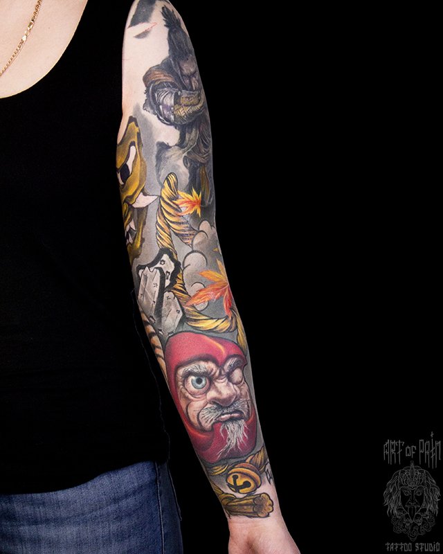 Татуировка мужская япония и реализм тату-рукав дарума и самурай 5245