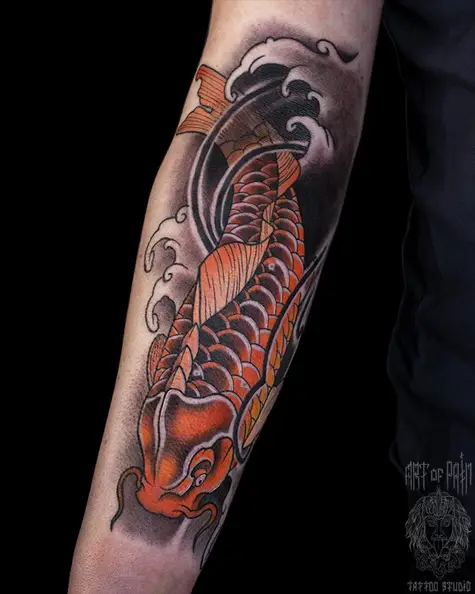 Татуировка мужская япония на предплечье карп и волна 5248