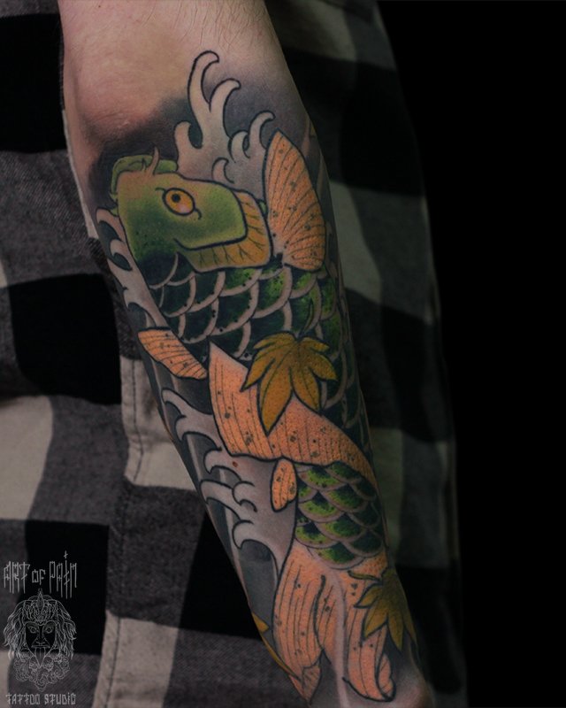 Татуировка мужская япония на предплечье зеленый карп 5251