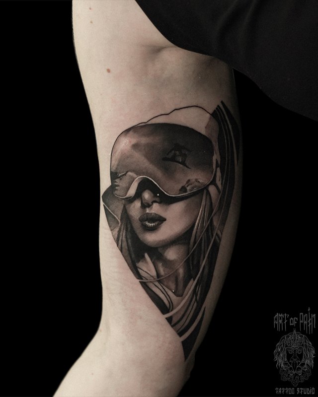 Татуировка мужская реализм на руке девушка в горнолыжной маске 5260