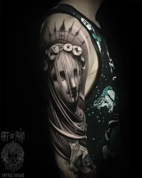 Татуировка мужская реализм на плече дева Мария (Анастасия Юсупова) 5290