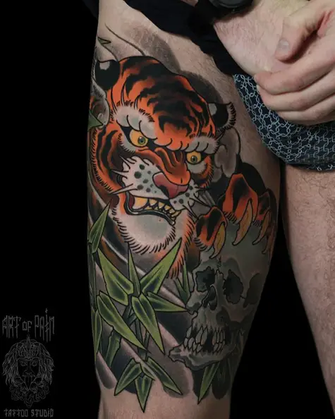 Татуировка мужская япония на бедре тигр и череп 5303