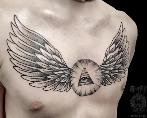 Татуировка мужская графика на груди массоны, око, крылья (Николай Орф) 5331
