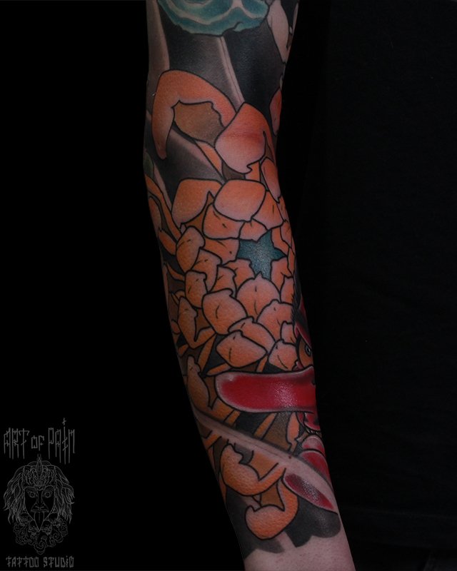 Татуировка мужская япония на предплечье желтая хризантема 5346