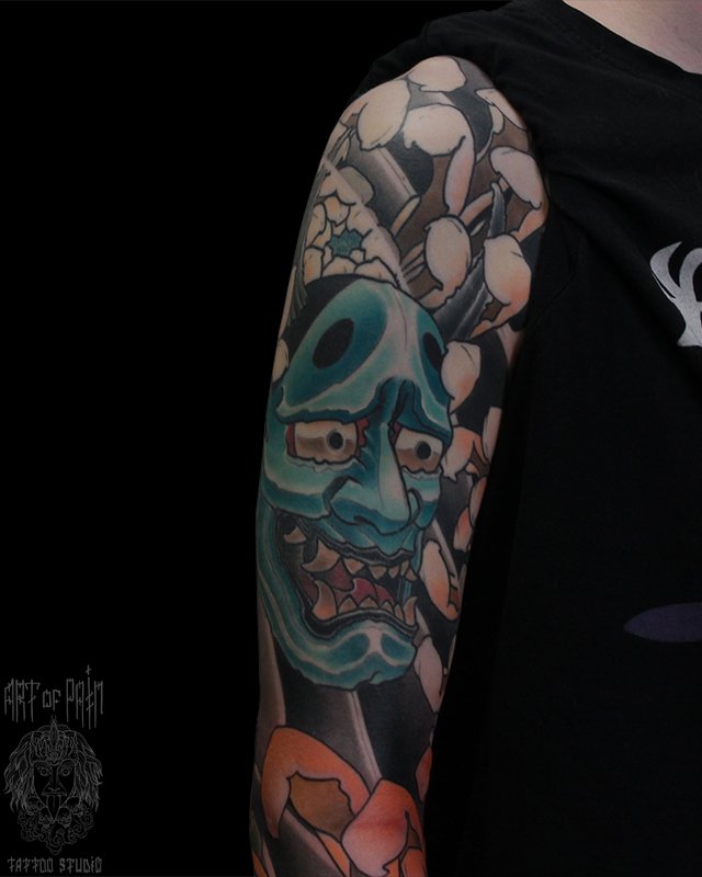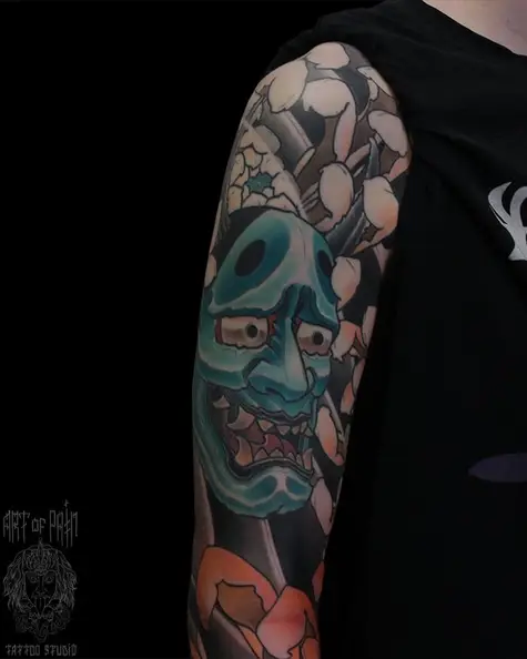 Татуировка мужская япония на плече голубая маска Ханья 5348