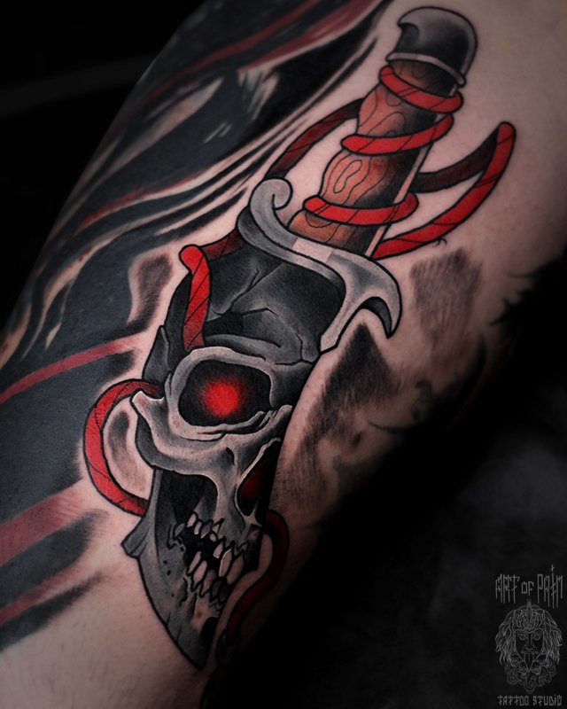 Татуировка мужская нью скул на бедре нож, череп 5350