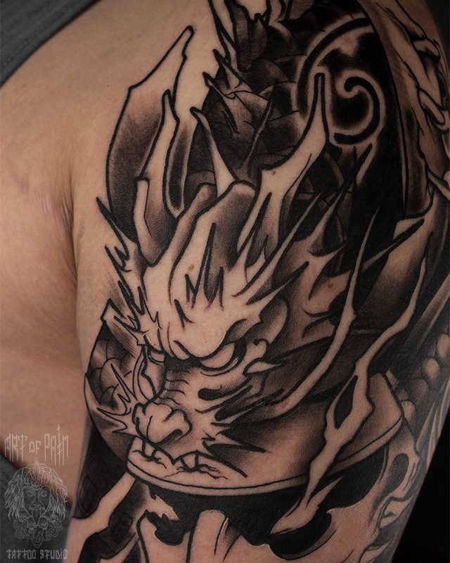 Татуировка мужская япония на плече шлем дракон 5352