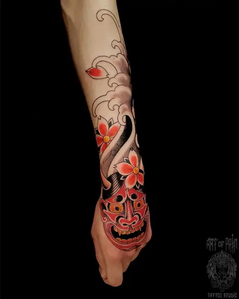 Татуировка мужская япония на руке ханья и цветы 5364