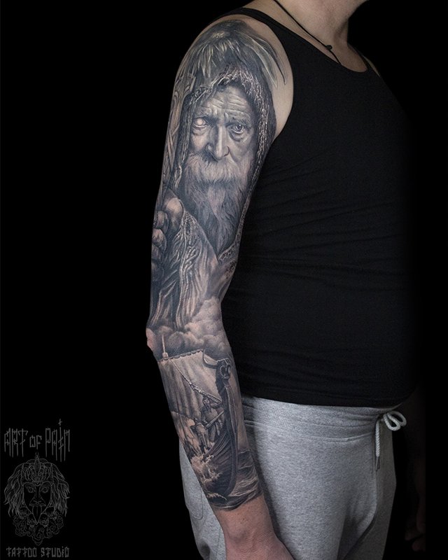Татуировка мужская реализм тату-рукав старец, викинги 5370