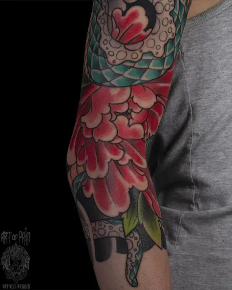 Татуировка мужская япония на руке пион 5376