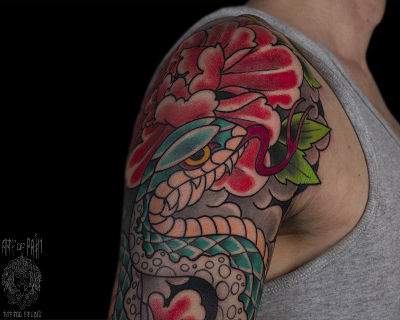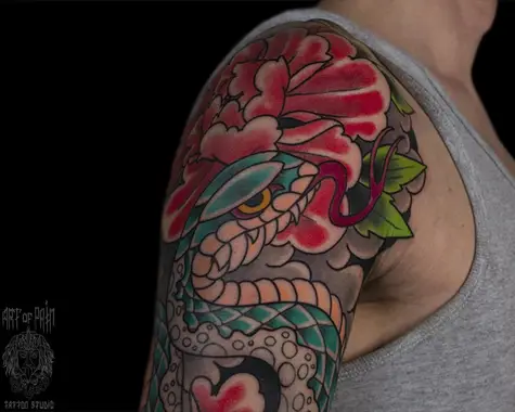 Татуировка мужская япония на плече змея, пионы 5378