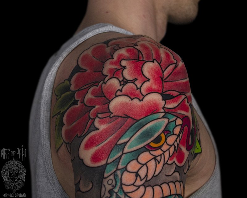 Татуировка мужская япония на плече змея и пионы 5379