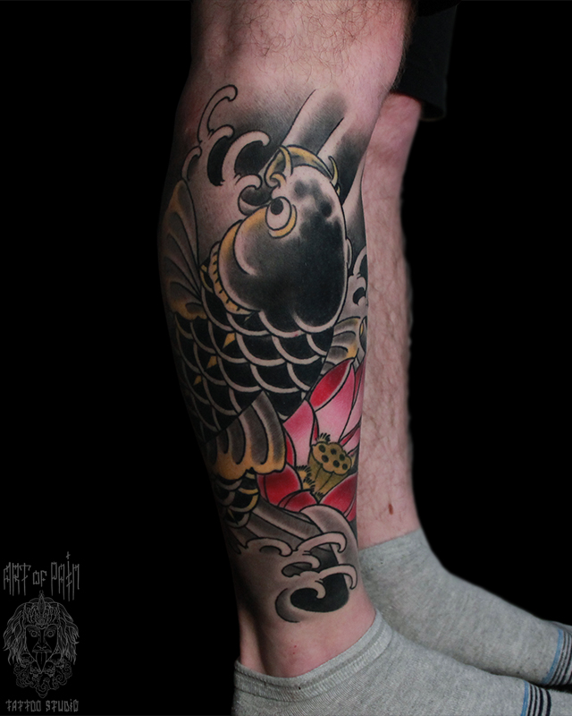 Татуировка мужская япония на голени карп и красный лотос 5443