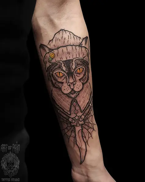 Татуировка мужская графика на предплечье кот 5477