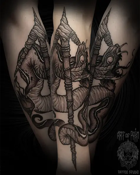 Татуировка мужская графика на предплечье змея и посох 5478