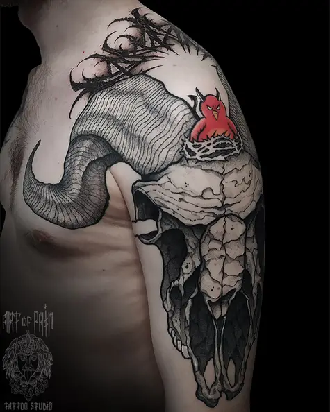Татуировка мужская графика на плече череп животного 5483