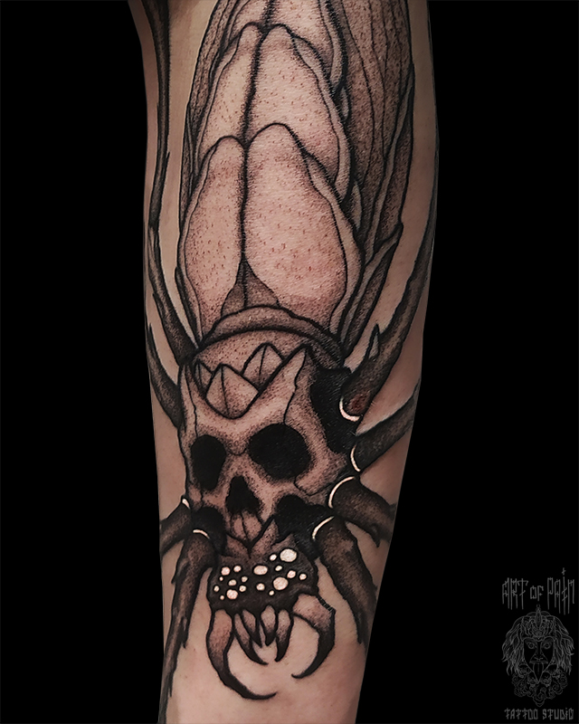 Татуировка мужская графика на предплечье насекомое с черепом 5484