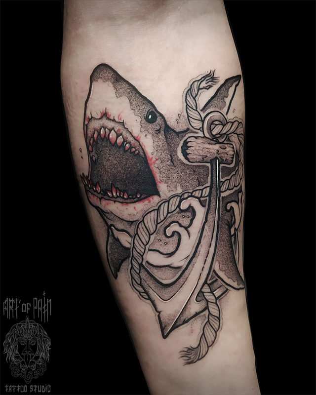 Татуировка мужская графика на предплечье акула и якорь 5487