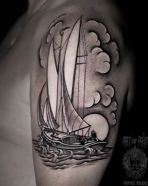Татуировка мужская графика на плече корабль (Юрий Хандрыкин) 5521